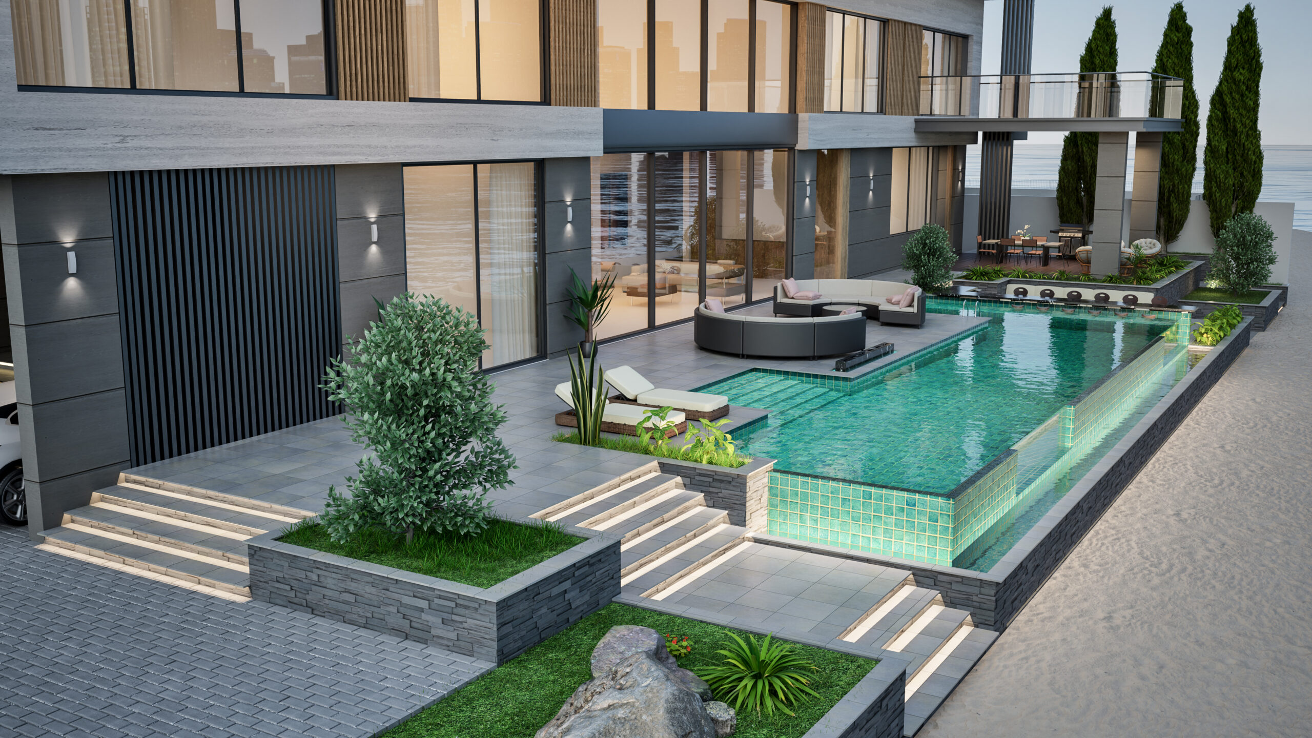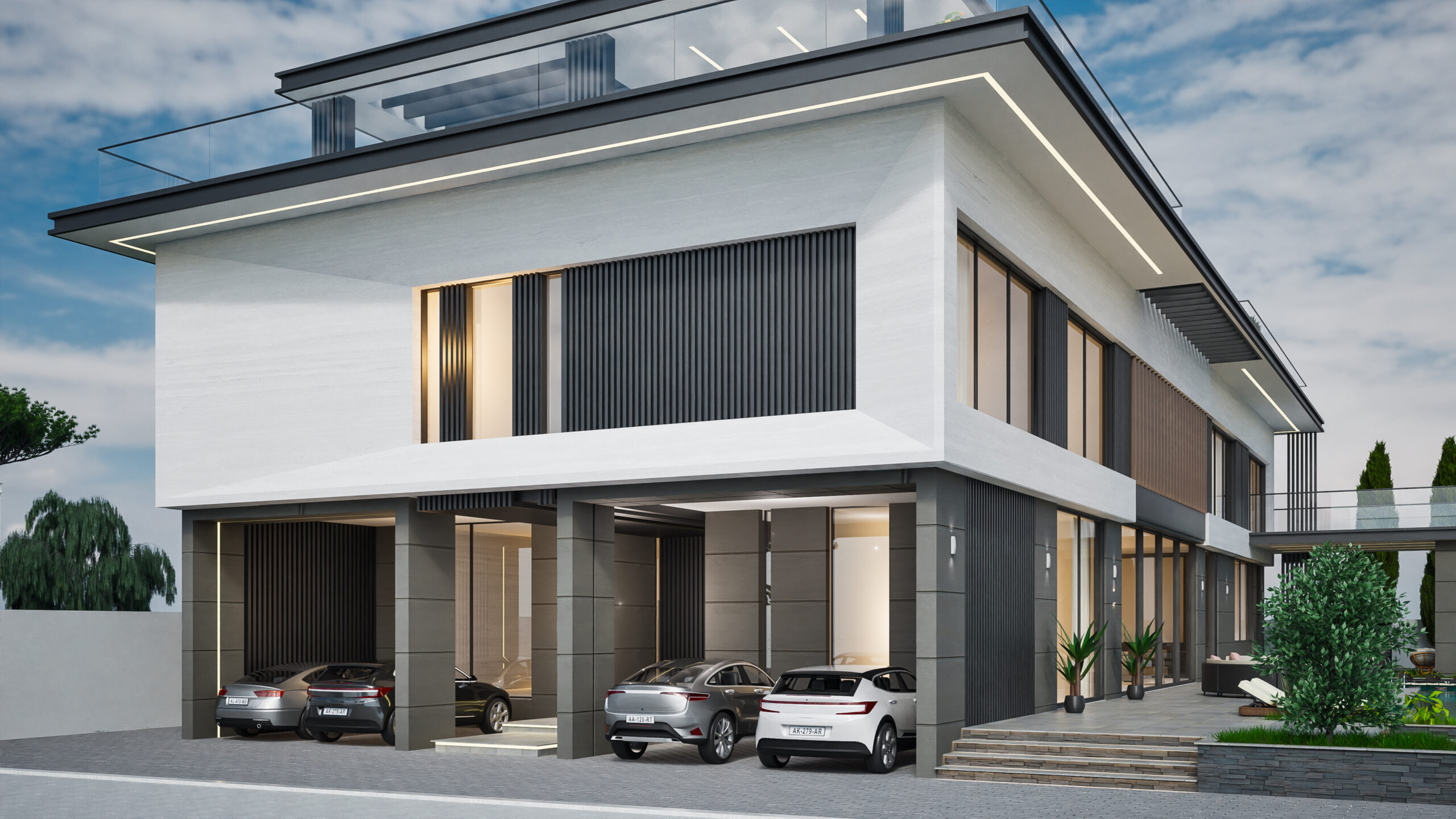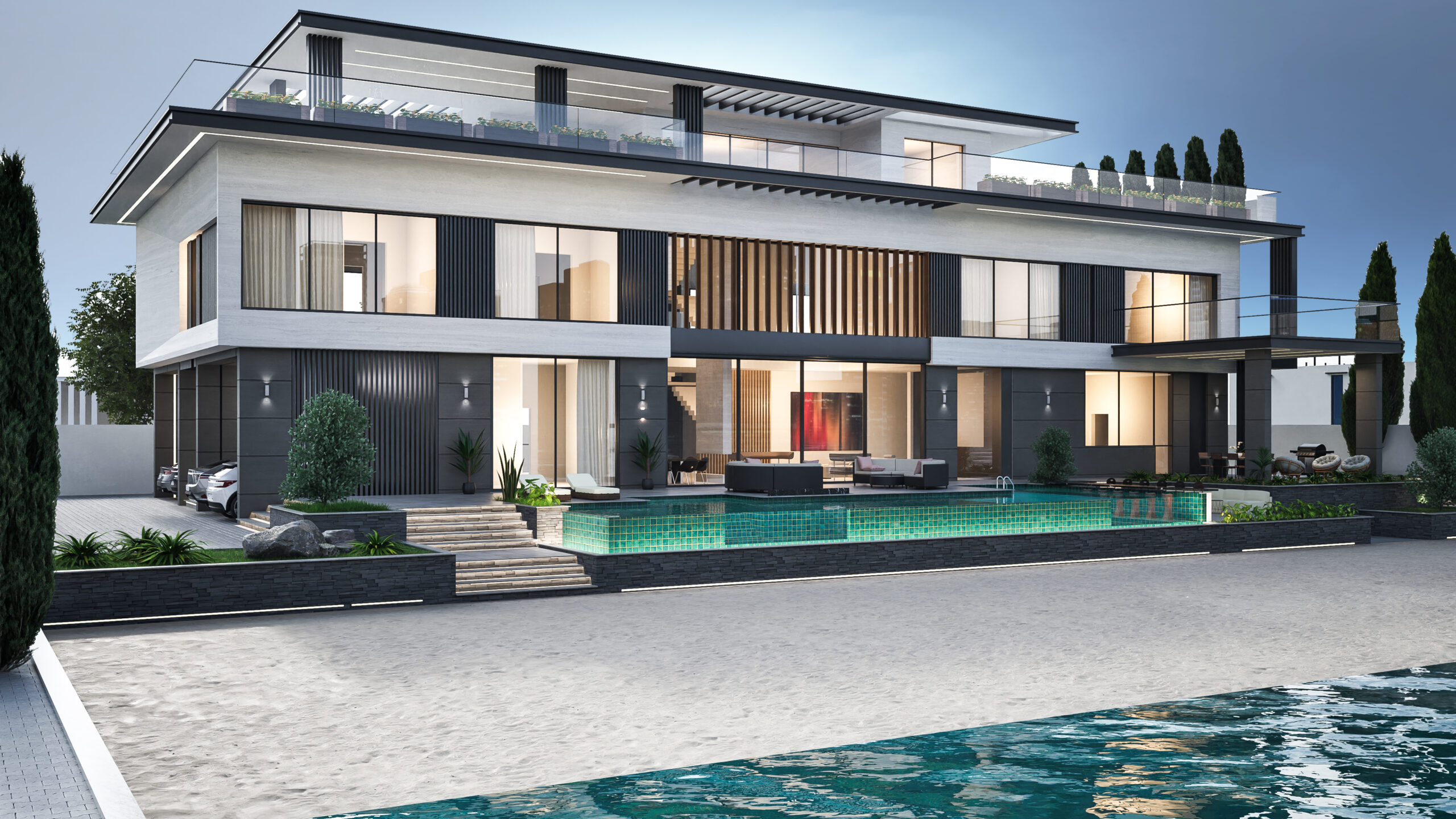 The villa is thoughtfully designed with open-plan interiors that seamlessly connect to outdoor terraces, landscaped gardens, and a striking infinity-edge pool. The use of modern materials, vertical accents, and natural finishes creates a balance of elegance and warmth.