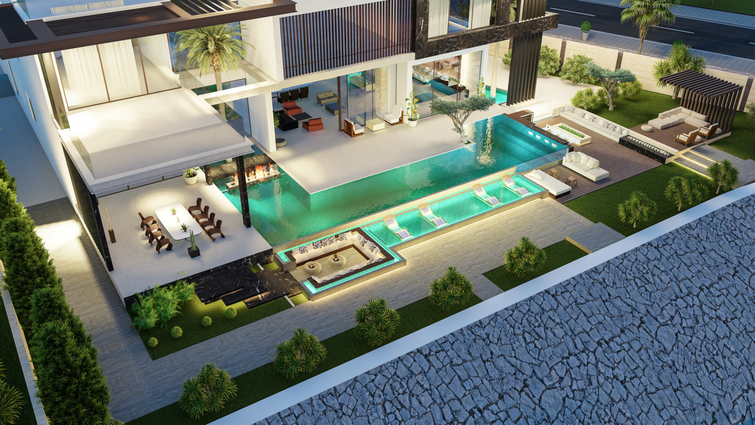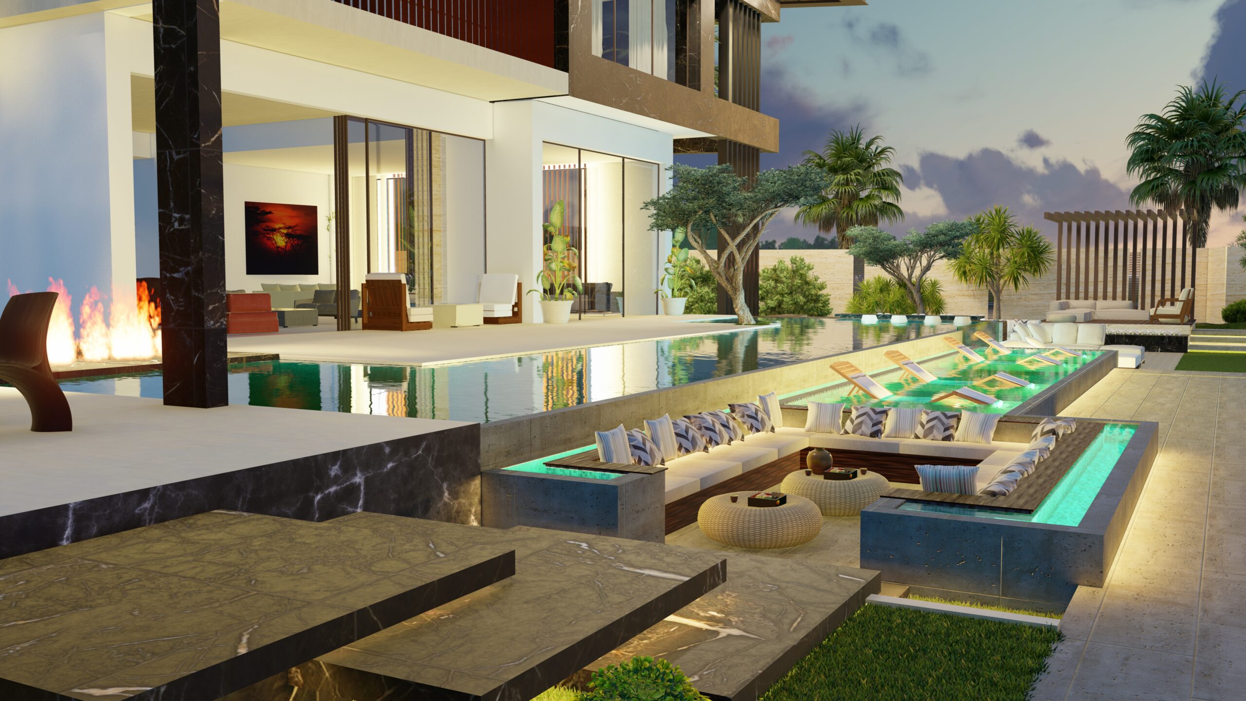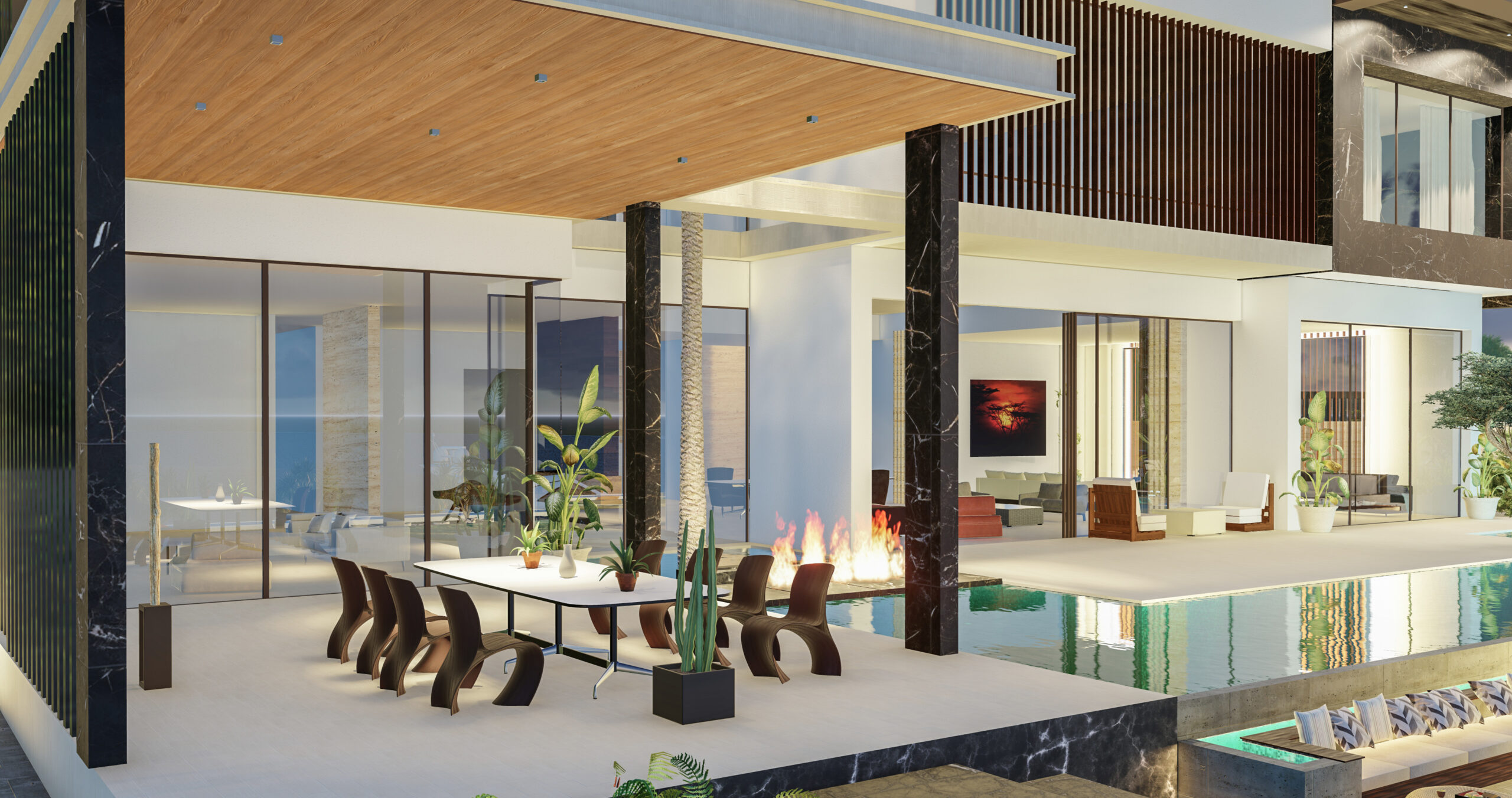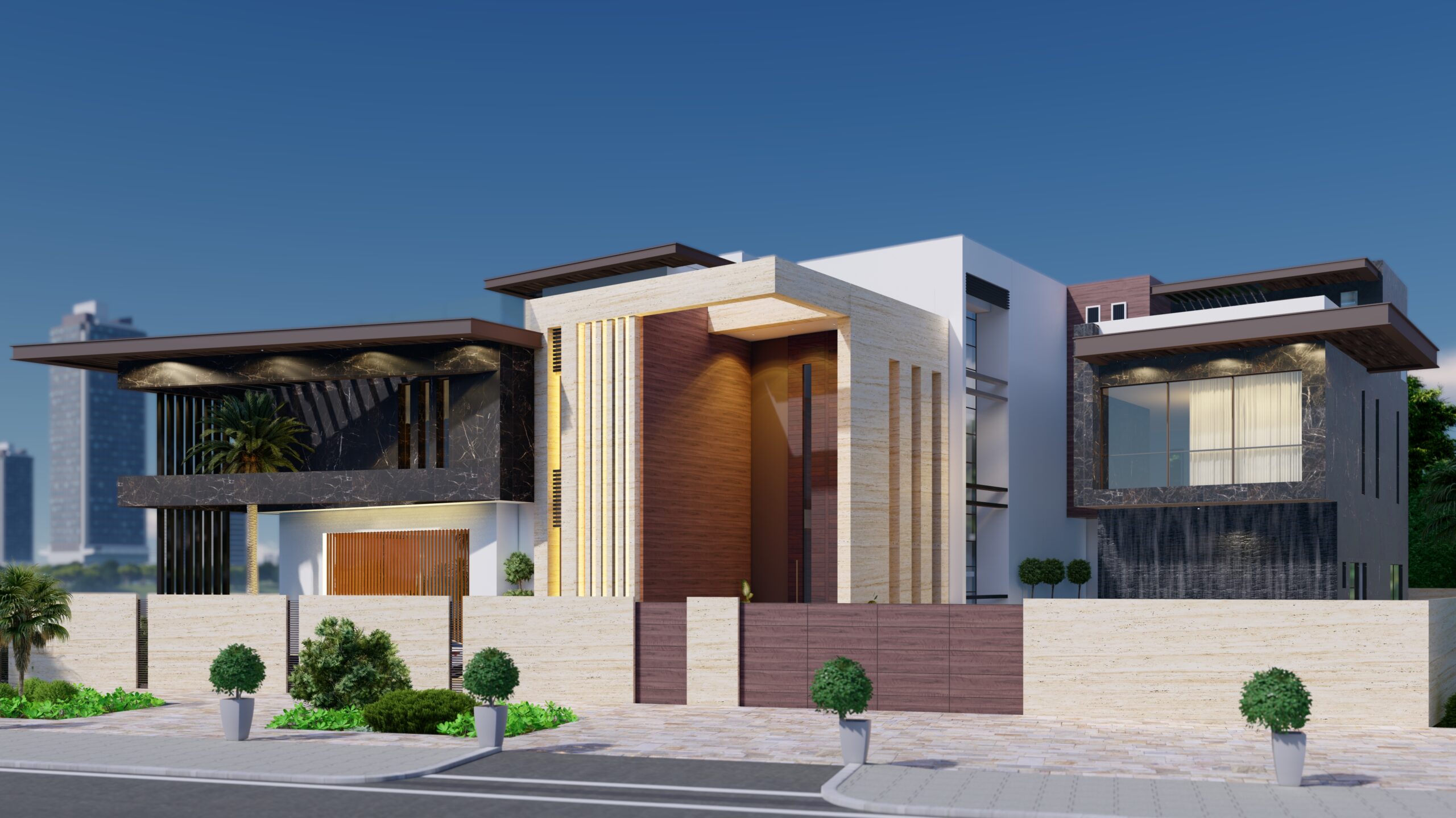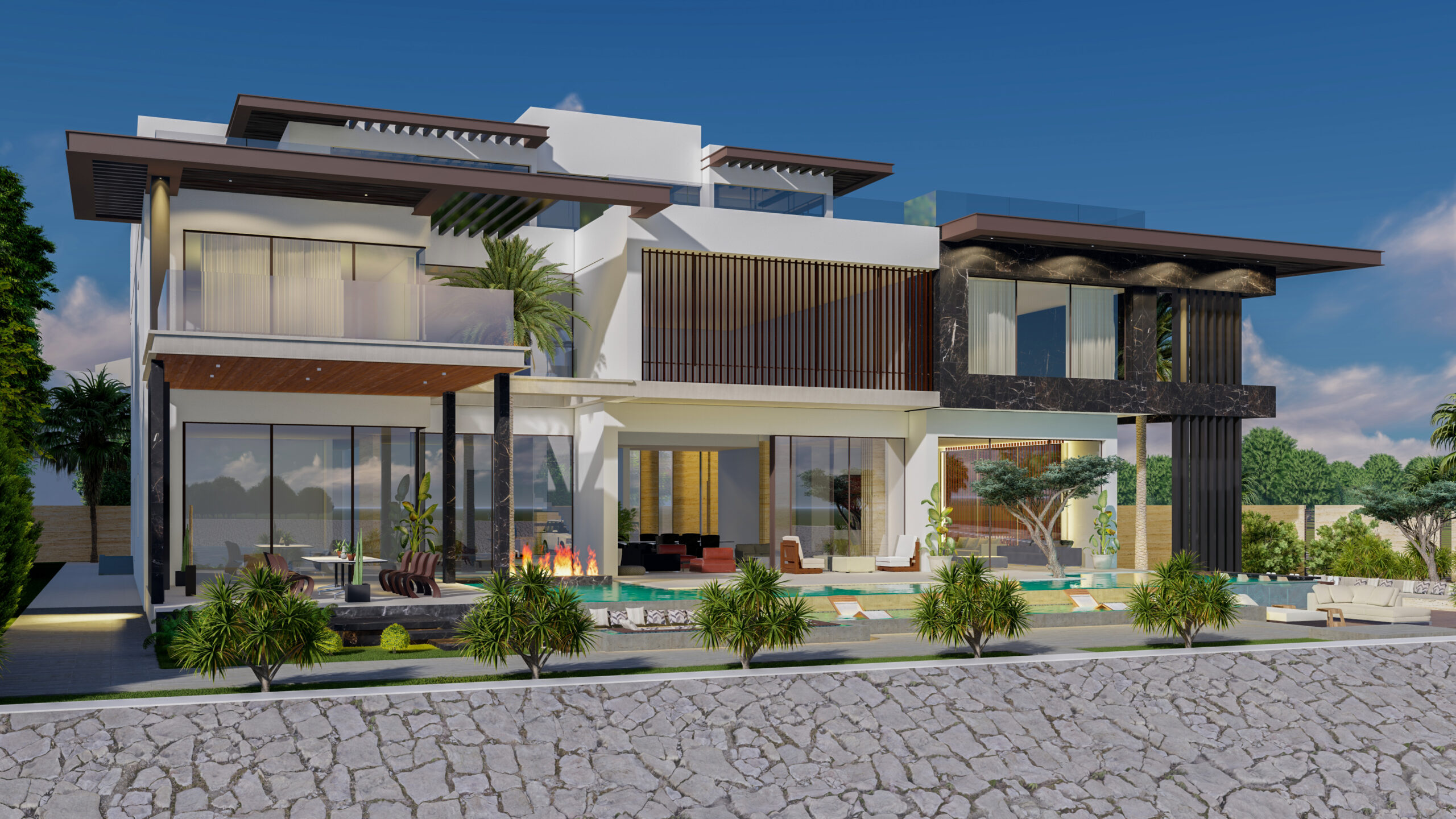 Generous terraces, landscaped gardens, and a pool overlooking the water create a resort-style ambiance, perfect for relaxation and entertaining. Natural finishes, vertical elements, and warm lighting enhance the villa’s sophistication, making it an exclusive retreat in Abu Dhabi.
