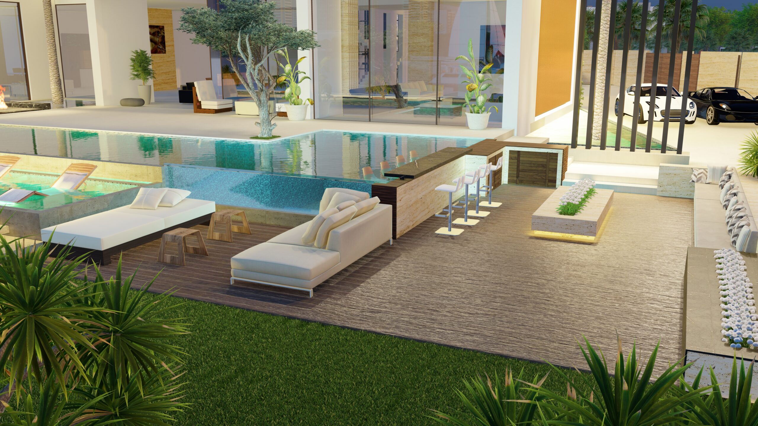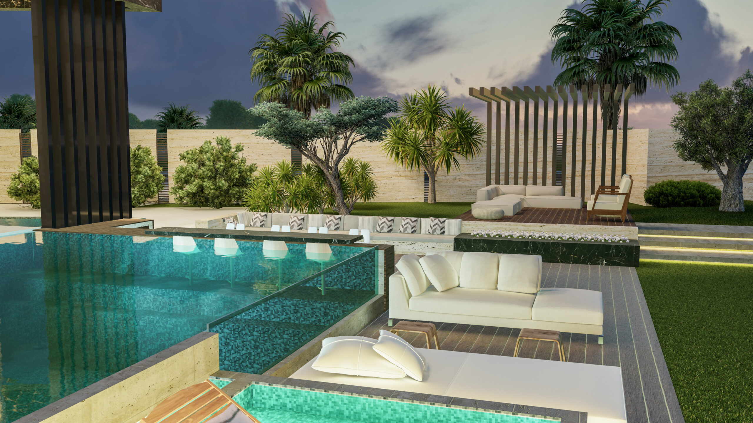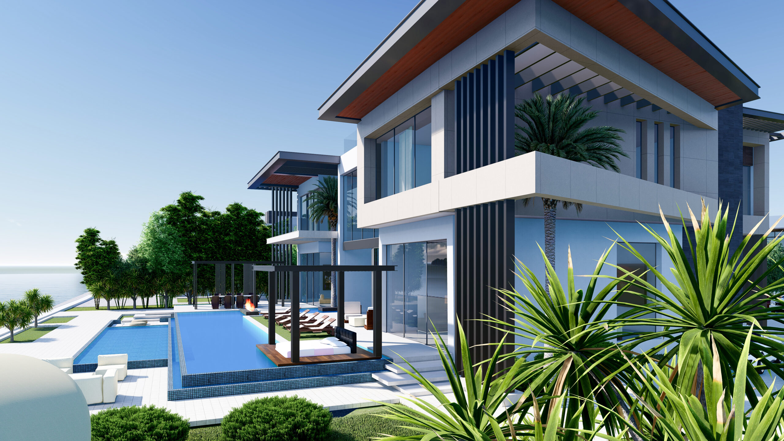 This elegant villa combines contemporary architecture with a serene waterfront lifestyle. The design features sharp modern lines, expansive glass façades, and a seamless connection between indoor and outdoor spaces.