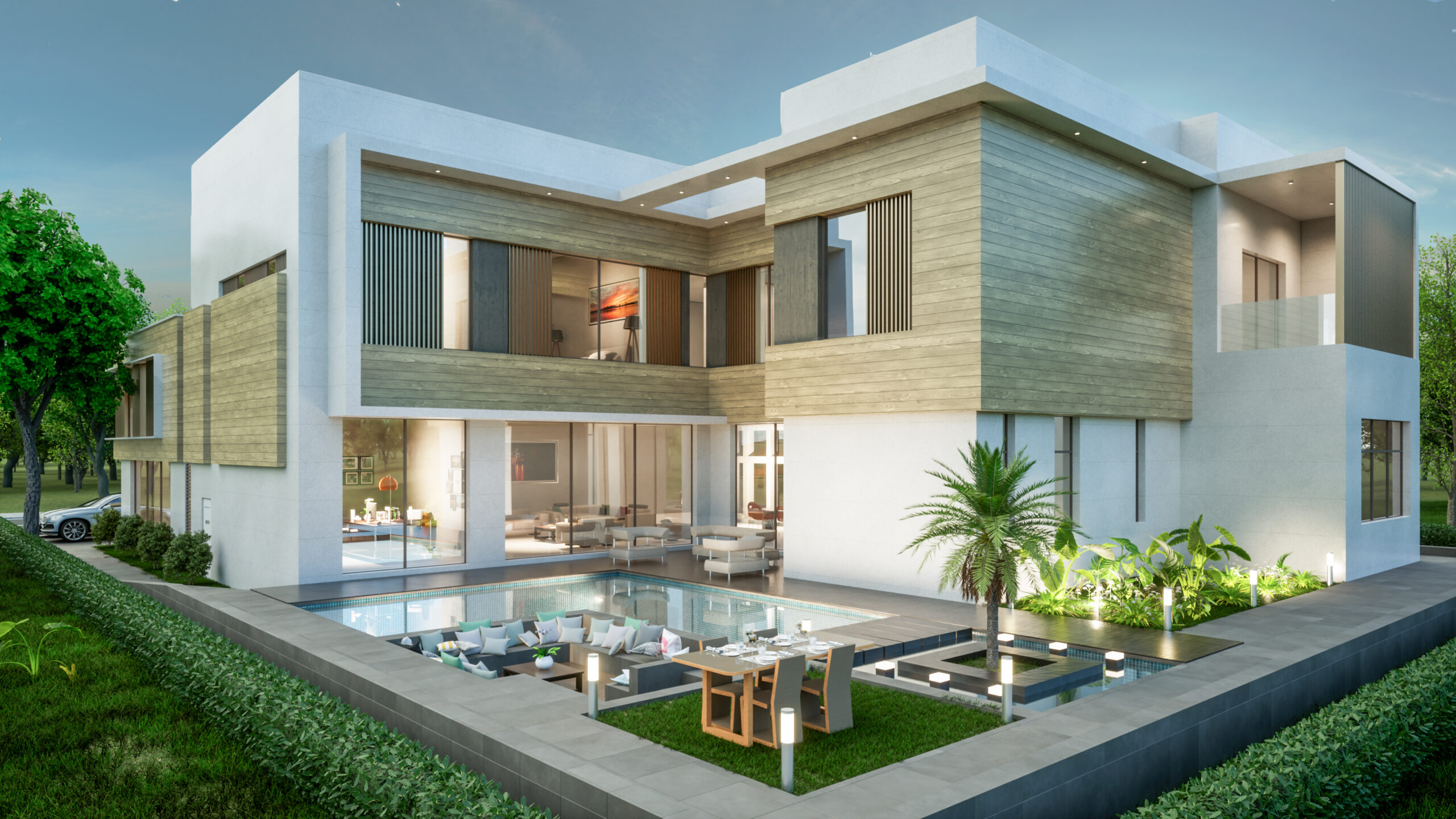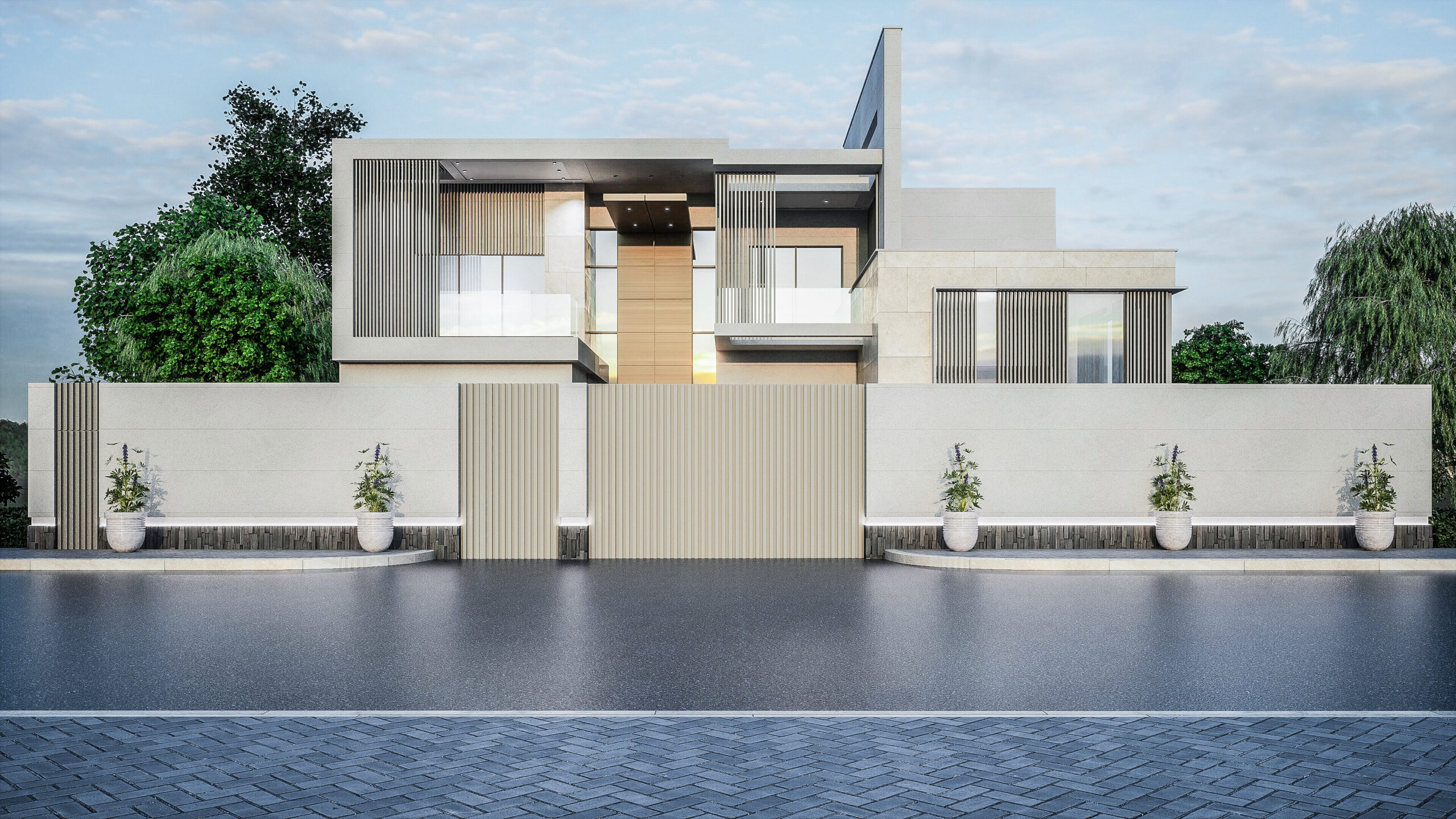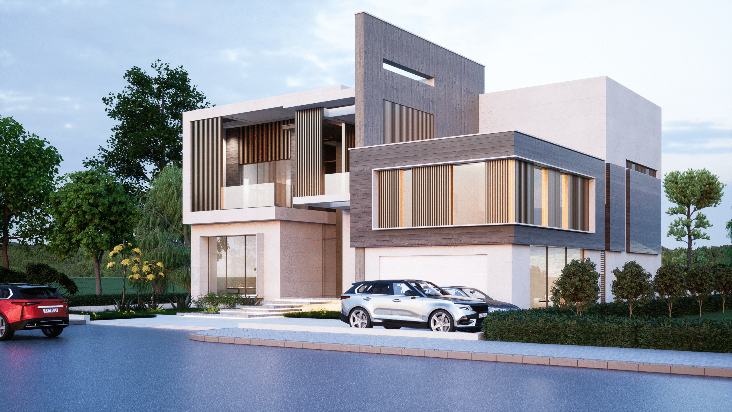 This villa showcases a bold interplay of modern volumes, natural textures, and clean geometry. With a façade blending warm wood tones, sleek concrete finishes, and expansive glazing, the design balances privacy with openness. Vertical fins and layered forms add depth, while the elevated entrance and large corner windows create a strong architectural statement. Inside, spacious layouts and abundant natural light enhance the sense of a refined, urban lifestyle living